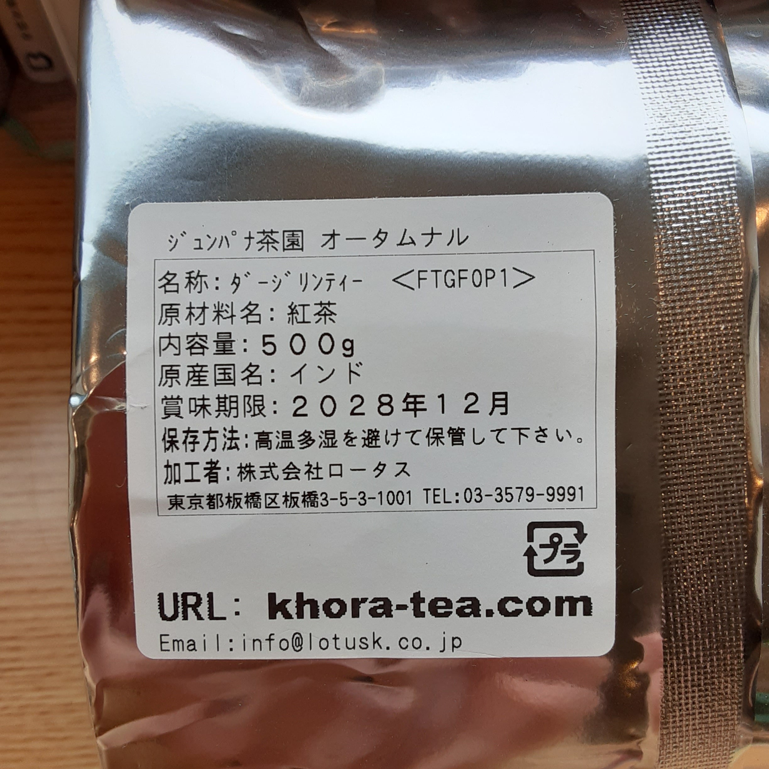 ダージリン地方の80以上の茶園の中で、ジュンパナ茶園は常にトップ3に評価される銘茶園です。今回お届けする商品は「秋摘みダージリン」オレンジペコ仕上げの大きめの茶葉です。ダージリンは、春、夏、秋と年に3回、香りのよい旬の時期を迎えます。そのうちの「秋摘み」は飲みやすい紅茶で、ティーポットの中で長時間蒸らしてもあまり渋くなりません。抽出時間3分です。本商品はジュンパナ茶園日本総代理店(株)ロータスさんより自店に届きます500g入り袋の茶葉を小分け包装したものです。賞味期限は小分けした月日+1年を記入しています。